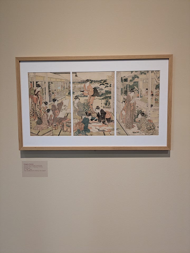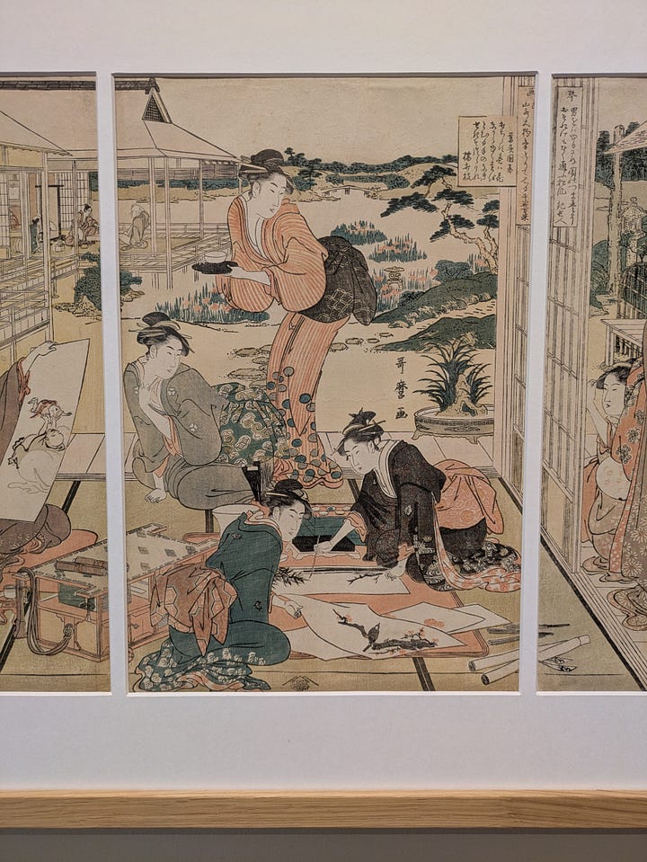 Utamaro’s The Four Arts shows beautiful women engaged in music, calligraphy, painting and gaming.
