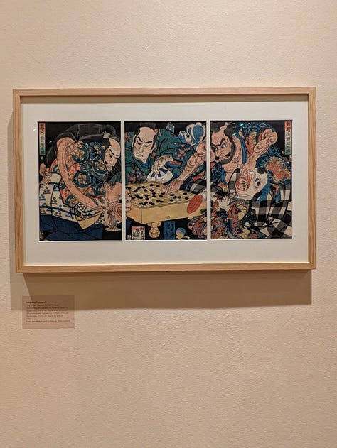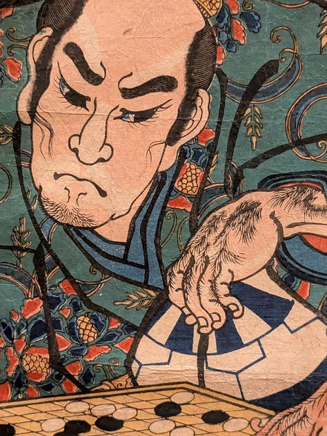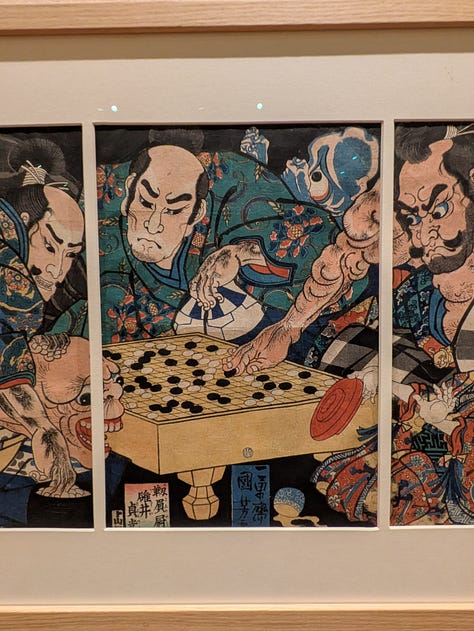 Utagawa Kuniyoshi’s Three Vassals of Yorimitsu depicts legendary warriors attacked by demons while trying to relax at a game.