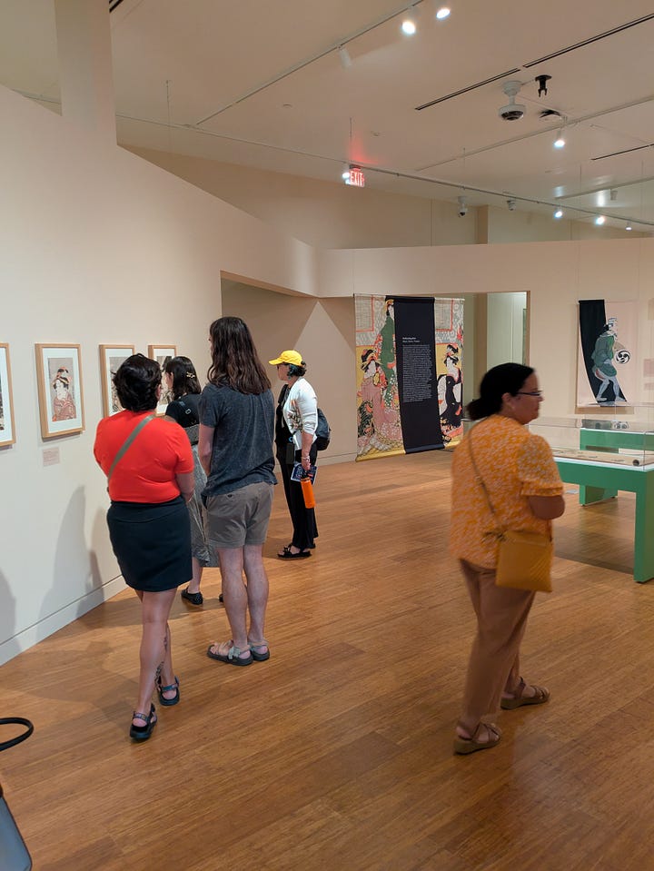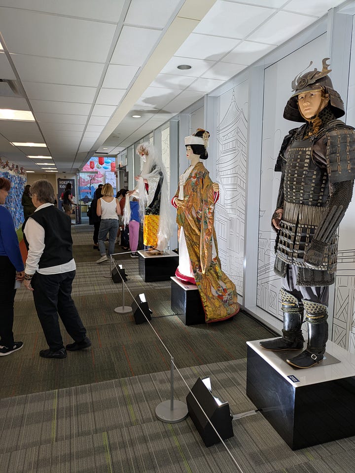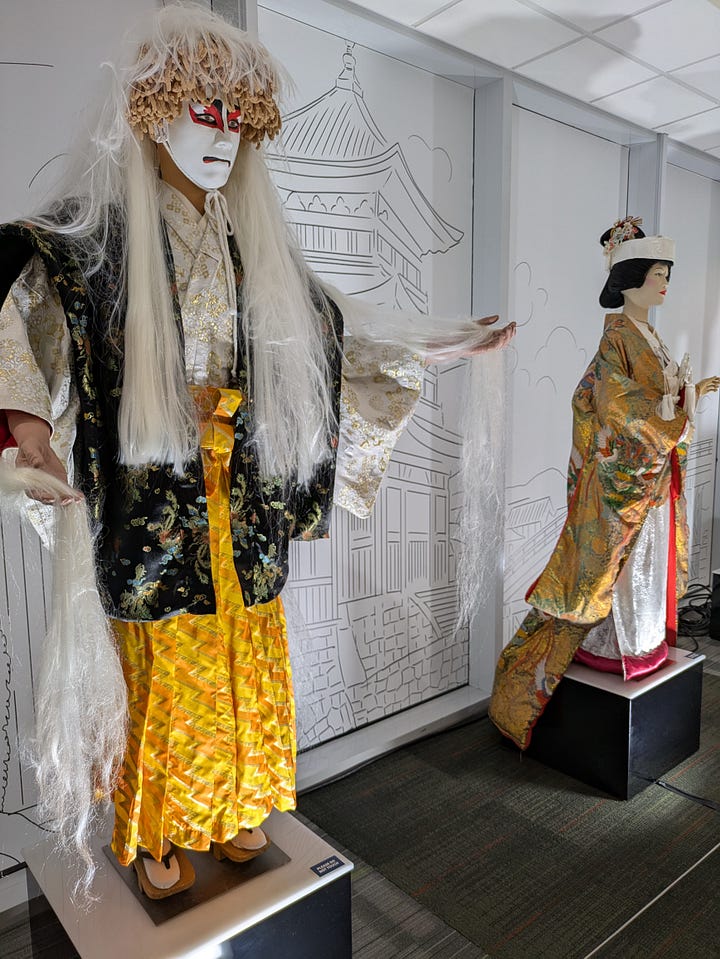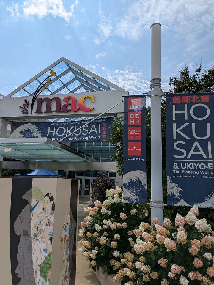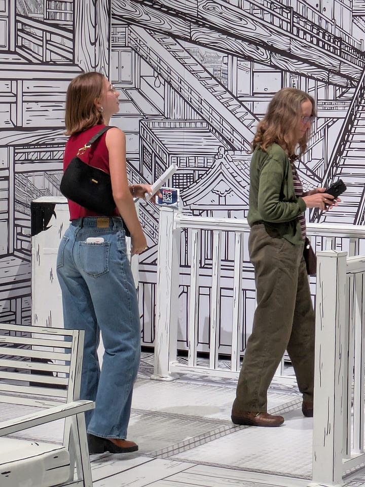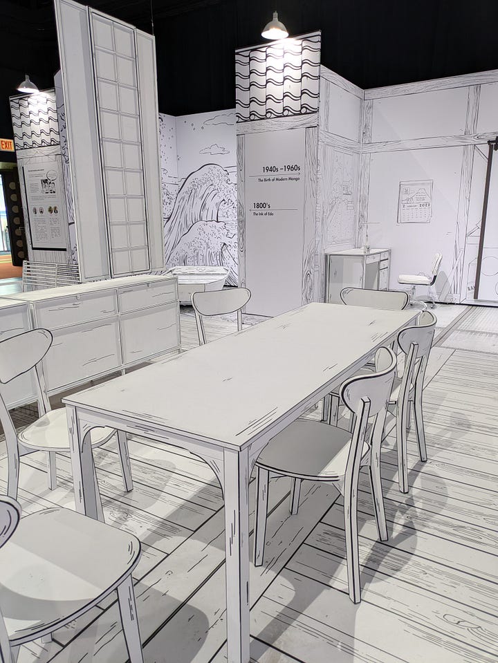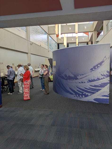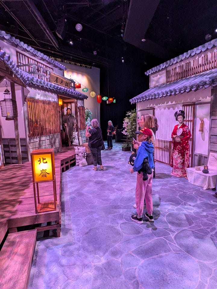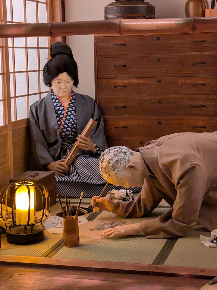 The actual prints of Hokusai and his contemporaries are set discreetly in a side gallery behind glass walls that are covered over with digital graphics. It is overwhelmed by the brassy entrance and enveloping educational displays (which do an admirable job of orienting the visitor). One must make a definite decision to detour into the hall; otherwise, one is easily tracked into the ancillary displays: a life-size re-creation of a street in old Tokyo, a row of mannequins dressed in period Japanese costumes, a crafting playroom for kids, and a tribute to the history of manga executed in cooperation with the owners of the 2d Restaurant in Chicago.