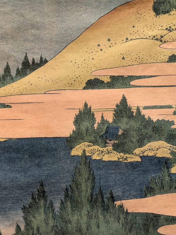 Hokusai’s own prints in the exhibition show the novelty in his work compared with his contemporaries in his use of perspective, lighting and color to produce landscapes that were delightful and comforting in their familiarity, but included the shadow of solitude and alienation; note below the little house among the trees on the island in the lake: