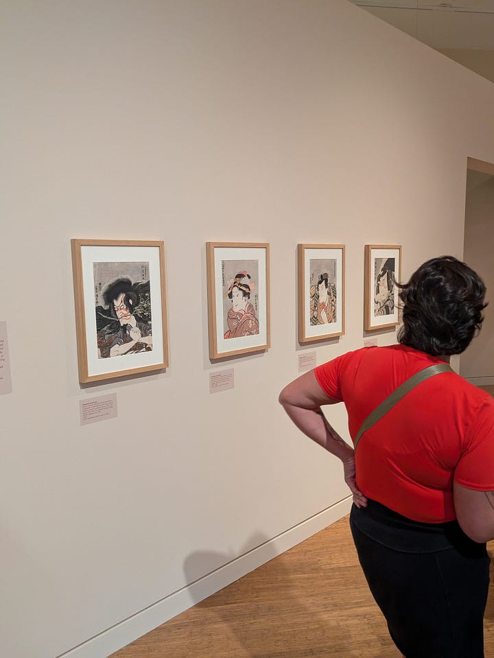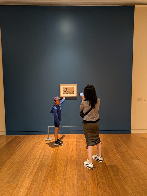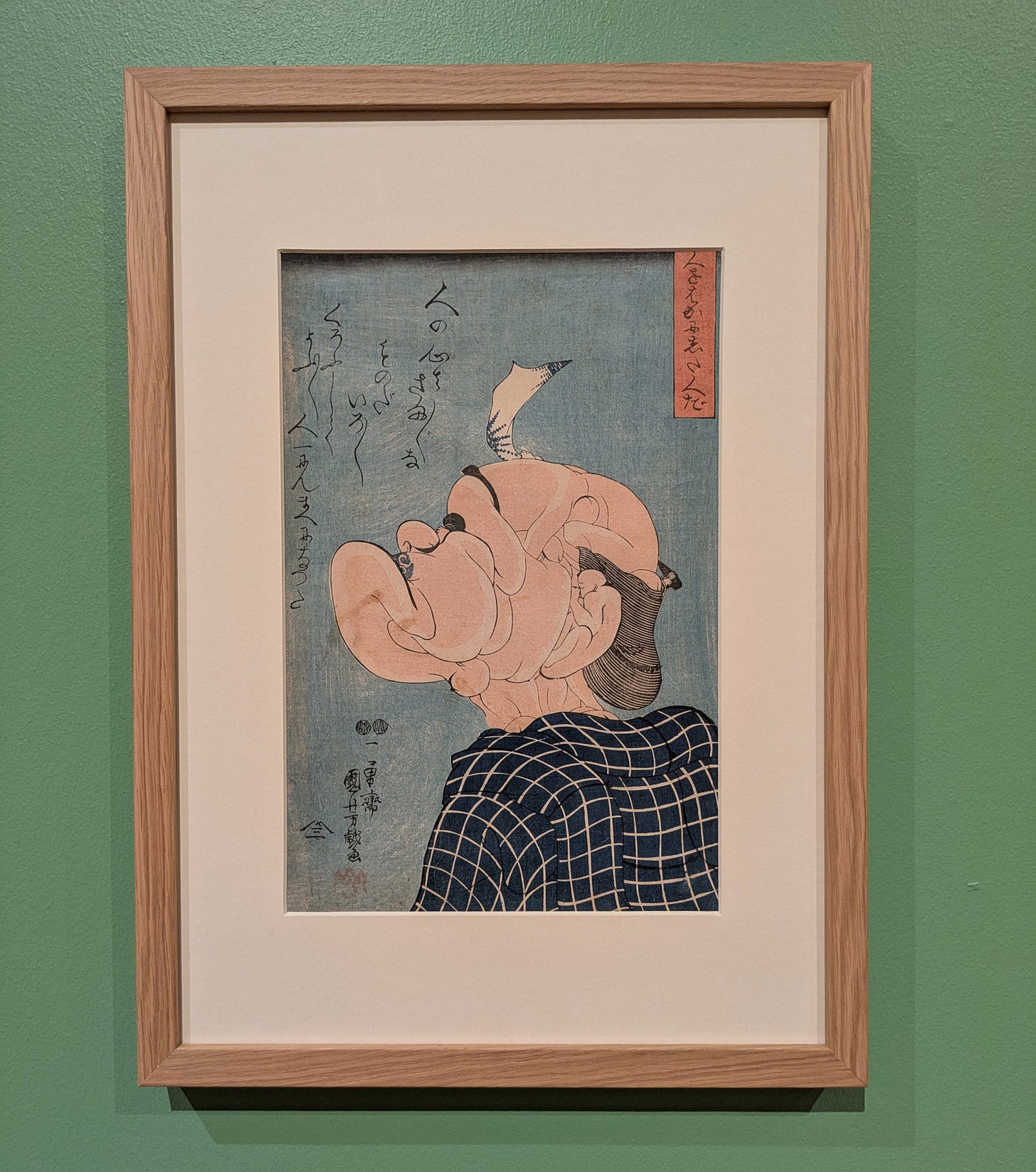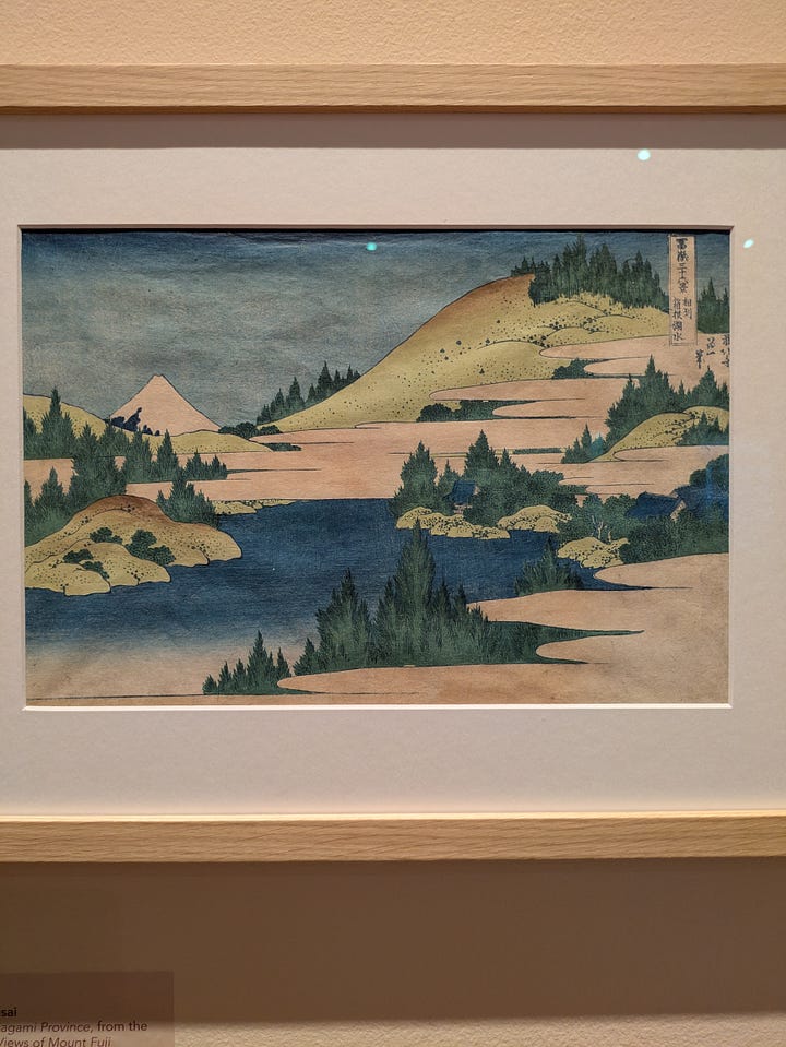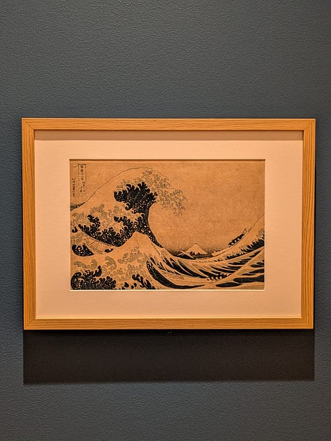 A print of Hokusai’s best-known work, The Great Wave off Kanagawa, is set apart, hung alone on a wall at the end of the gallery, somewhat like the Mona Lisa in the Louvre:
