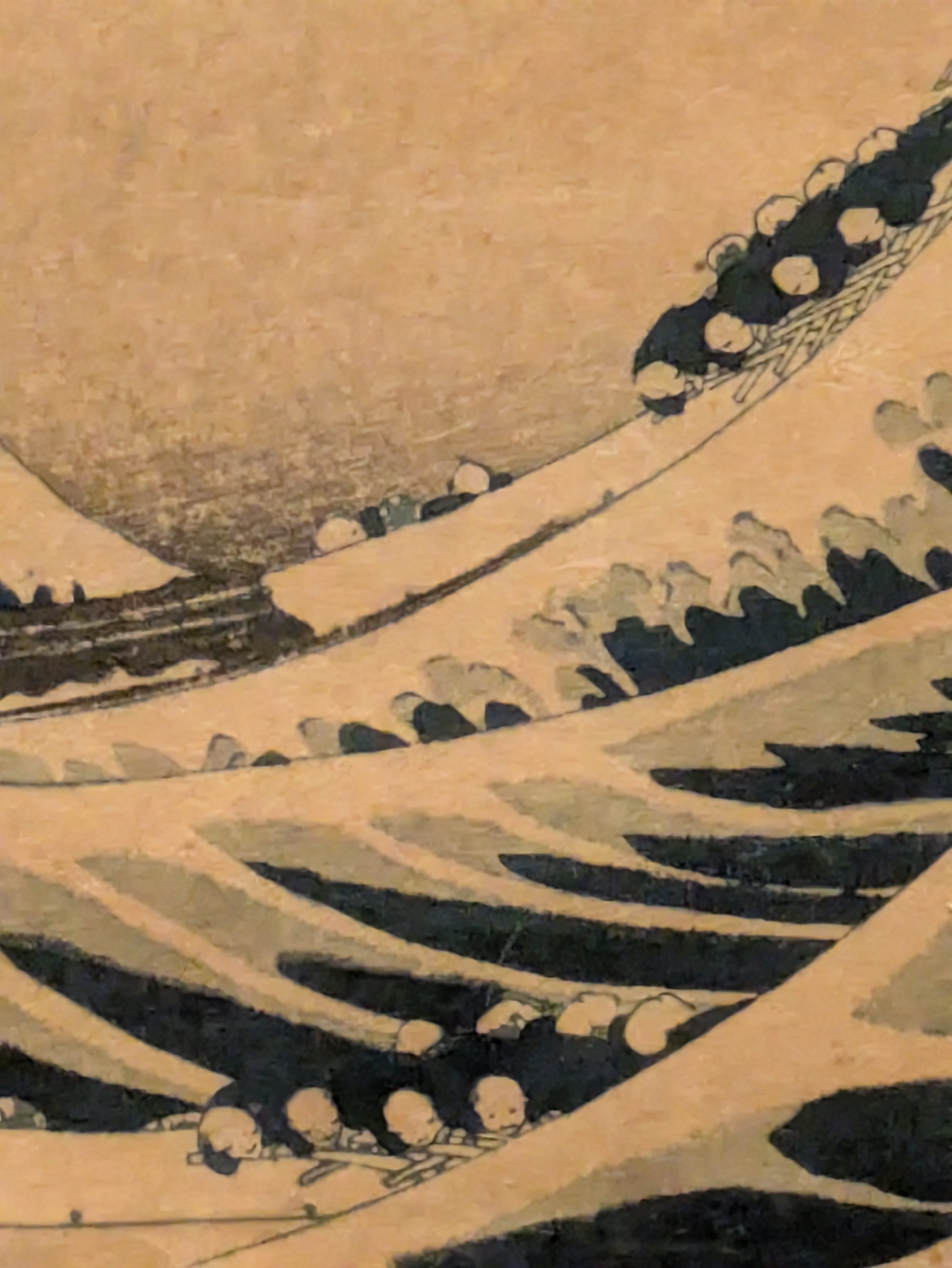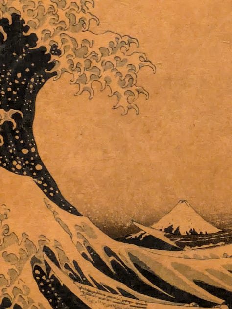 I have seen other copies of The Great Wave before, both original prints and of course the endless reproductions and derivative works. The composition is masterful, the wave is awesome, Fuji is sublime; but I was drawn in this visit, as I have been on occasions before, to the men in the boats, the ones who bore the terror and paid the price for the aesthetic distillation of the work we are privileged to contemplate in the dim quiet. If the print is in any sense a great work of art, it is because of what those crews saw in the foam and the water that was coming over the wales of their craft: the reflection of their mortality.