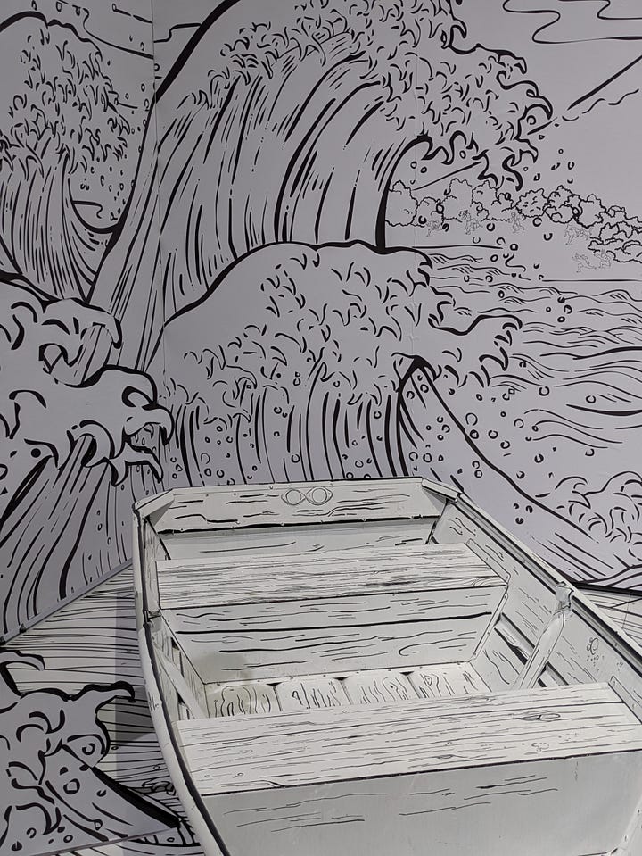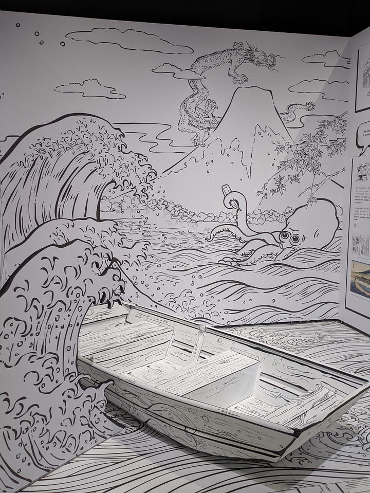 The manga tribute is fitting since Hokusai initiated the tradition in Japan with his notebooks of whimsical drawings, and coined the name (whose original meaning gives this article its title). Among other features, it gives the visitor a chance to get an immersive picture of oneself in a 2d/3d black-and-white version of the Great Wave print itself.